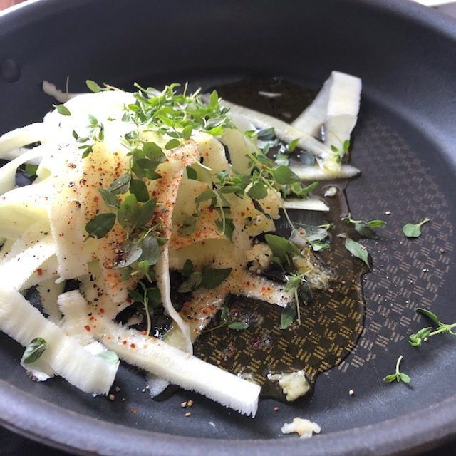 - Fräs upp den strimlade zucchinin med timjan, vitlök och chili i stekpannan.