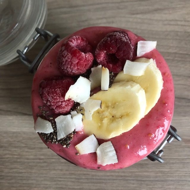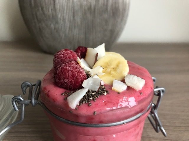 Idag tisdag lyxar vi en hallon- och banansmoothie till frukost. Gott, hälsosamt och lätt att mixa samman under tidig morgon.